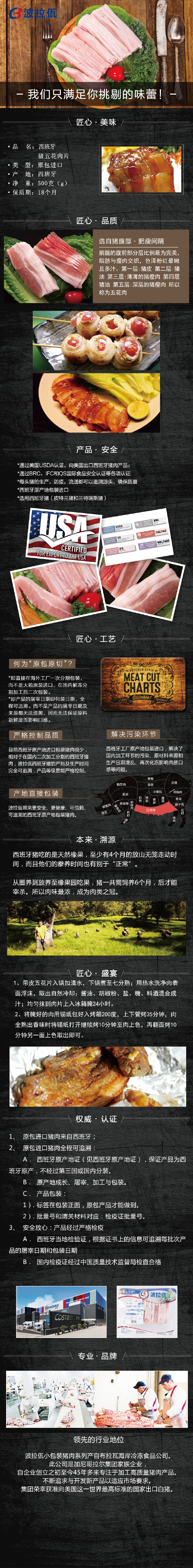 產(chǎn)品介紹:西班牙波拉佤豬五花肉片——西班牙原包裝進(jìn)口,精選豬前腿的腹前部分層比例最為完美,脂肪與瘦肉交織,色澤粉紅最嫩且多汁。第一層:豬皮 第二層:豬肉 第三層:薄薄的豬瘦肉 第四層:豬油 第五層:深層的豬瘦肉 所以稱為五花肉。原始整塊切割、無污染、無添加、無注脂、無激素、保留豬肉的天然口感。